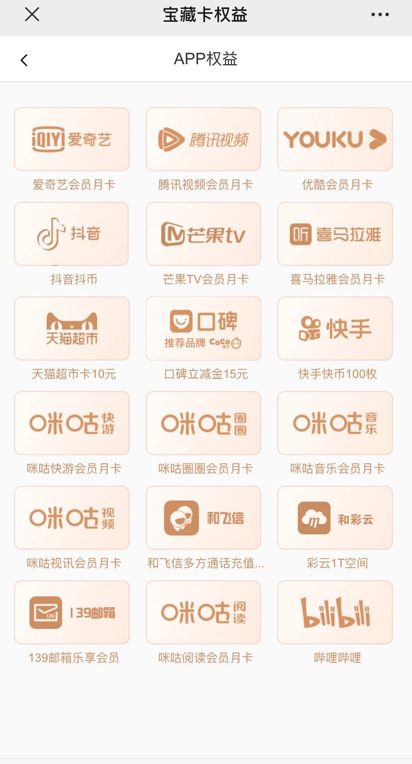 有开通花卡19d的去微信公众号:移动花卡-权益-宝藏卡权益领取。可以领取3个app免流量,还有,重要的是可以领取app权益:视频会员月卡还有其他一些券,如图: