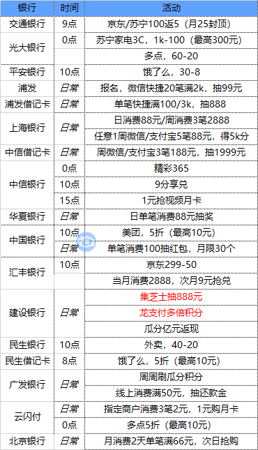 活动:周一/支付宝、周二/微信、周三/京东苏宁、周四/云闪付、周五周六/买单吧、周日/美团(4月30日截止)