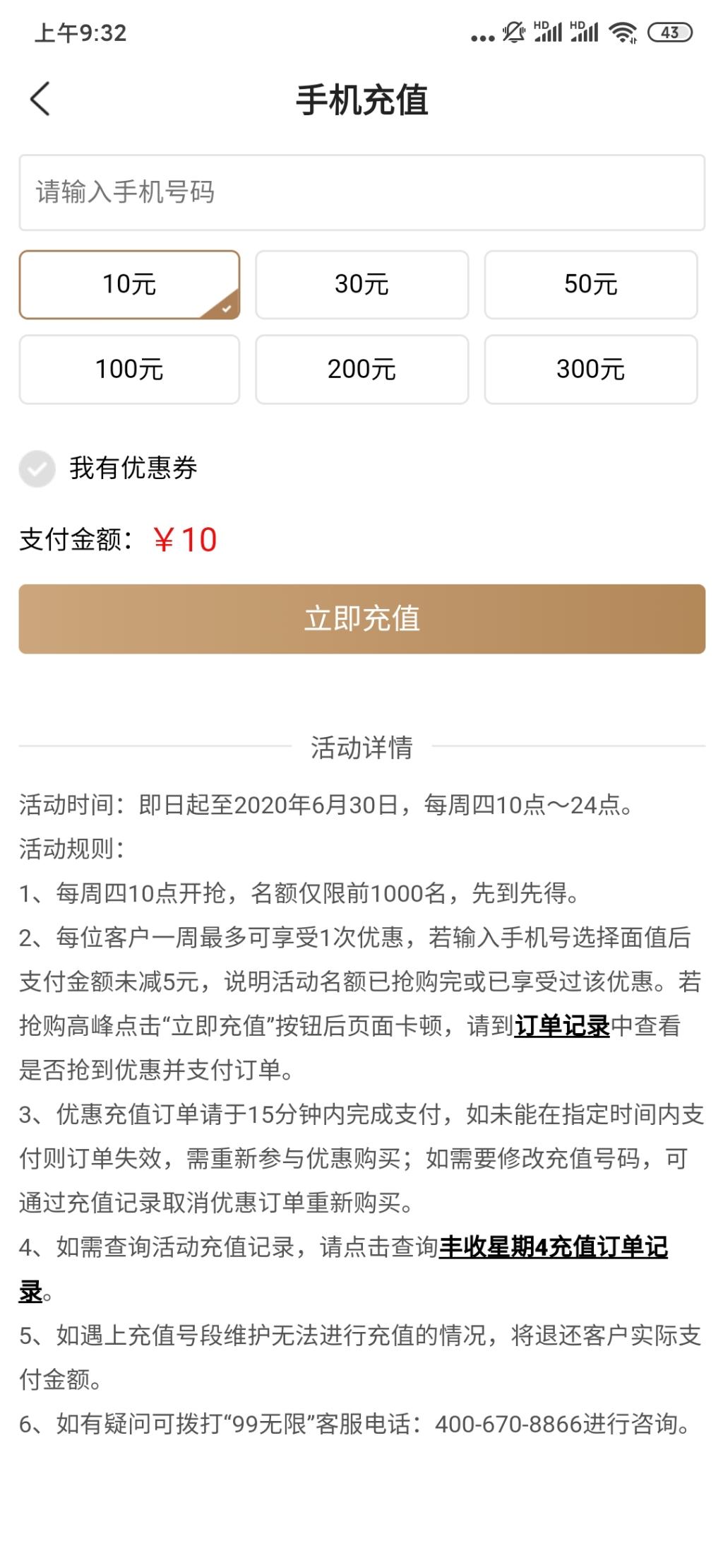 话费充值满10减5