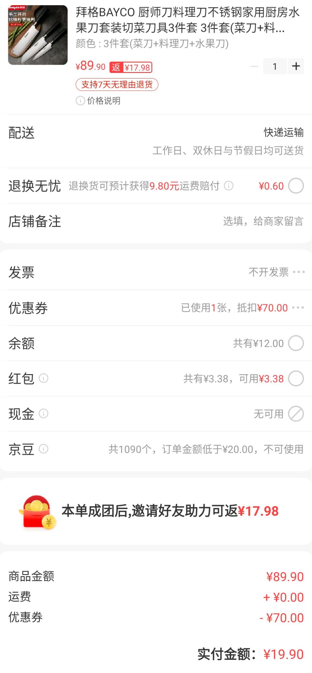 扫码领券,89-70配合优享免息-2实付17.9京喜小程序或app返17.98元拜格刀具3件套菜刀 料理刀 水果刀19.9元。链接带返利,发不上来,需要请自转!!!