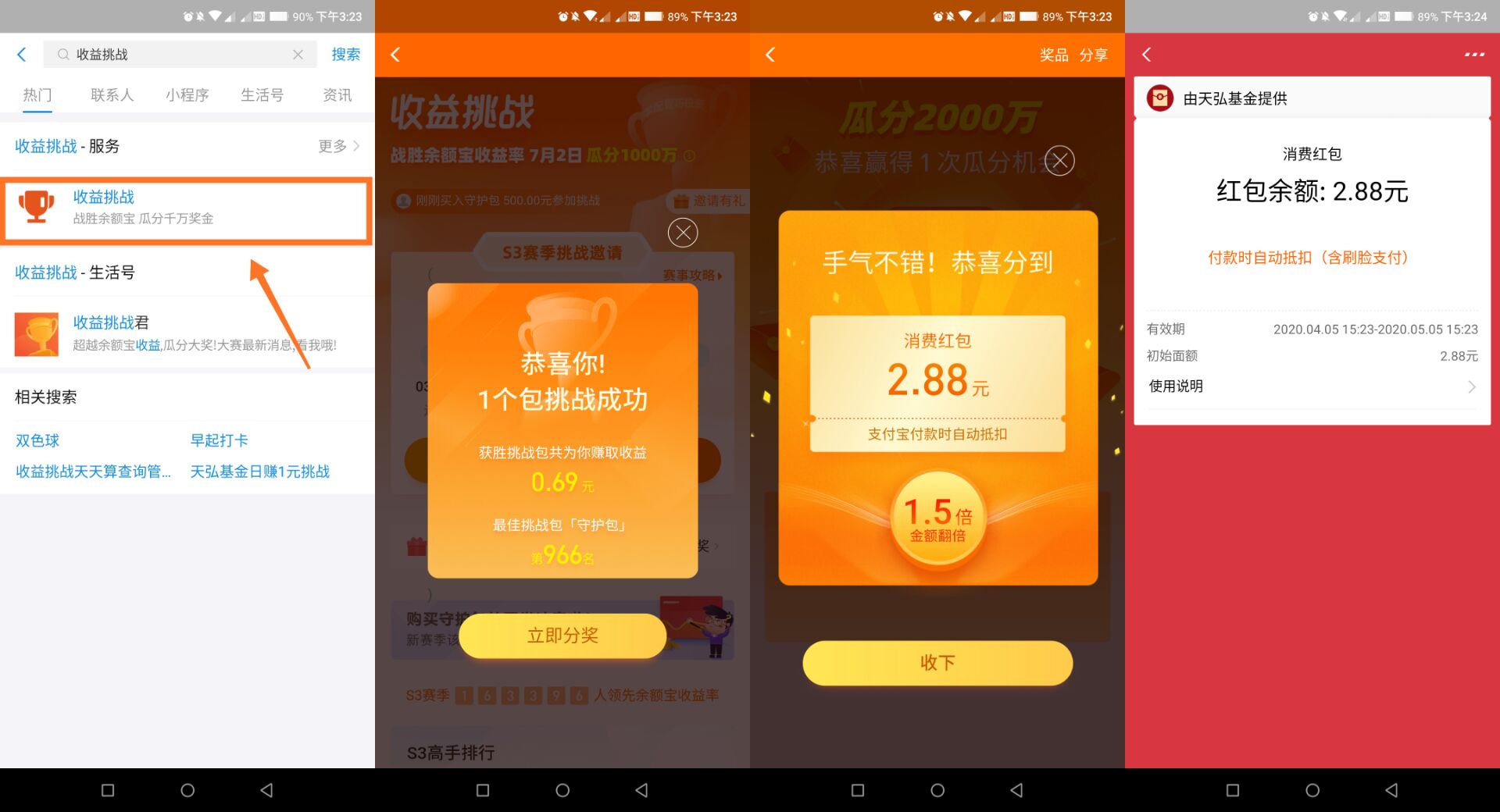 支付宝搜索“收益挑战”,进去可以查看自己的名次,然后直接开奖,之前参加过300挑战包的基本都是966名,开出来基本都是3元左右,直接吧码tx,不要去翻倍,翻倍的是基金券,不确定自己有没有参加的,进去看看就知道了,不弹就是没参加