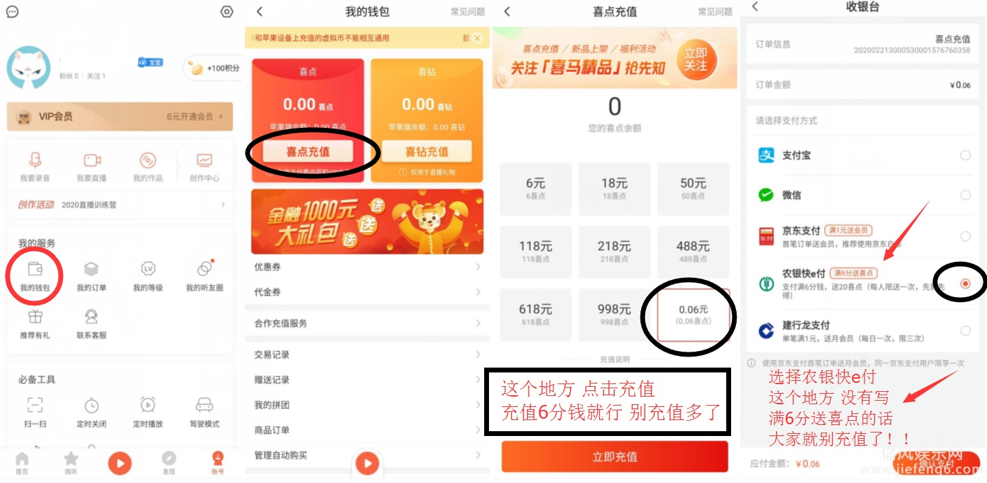 2.输入0.06->支付方式选->农银快e付->会显示满6分送20喜点->没显示说明结束
