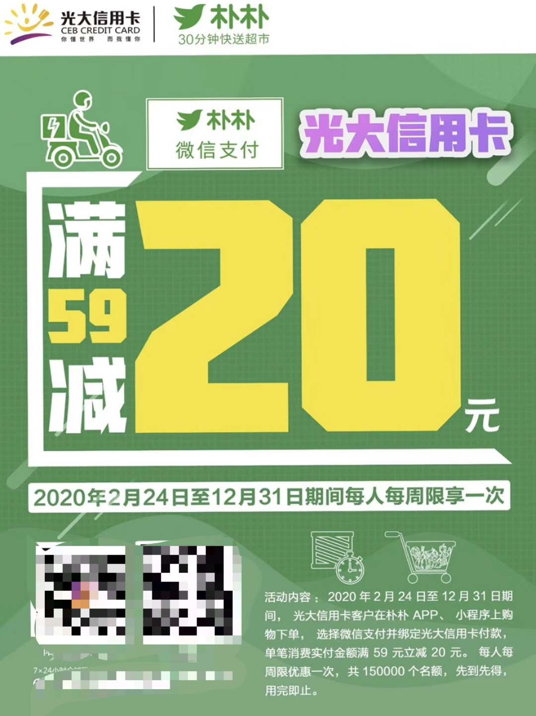 2020年2月24日至12月31日期间,光大xing/用卡客户在朴朴APP、小程序上购物下单,选择微信支付并绑定光大xing/用卡付款,单笔消费金额满59元立减20元。每人每周限优惠一次,共150000个名额,先到先得,用完即止。