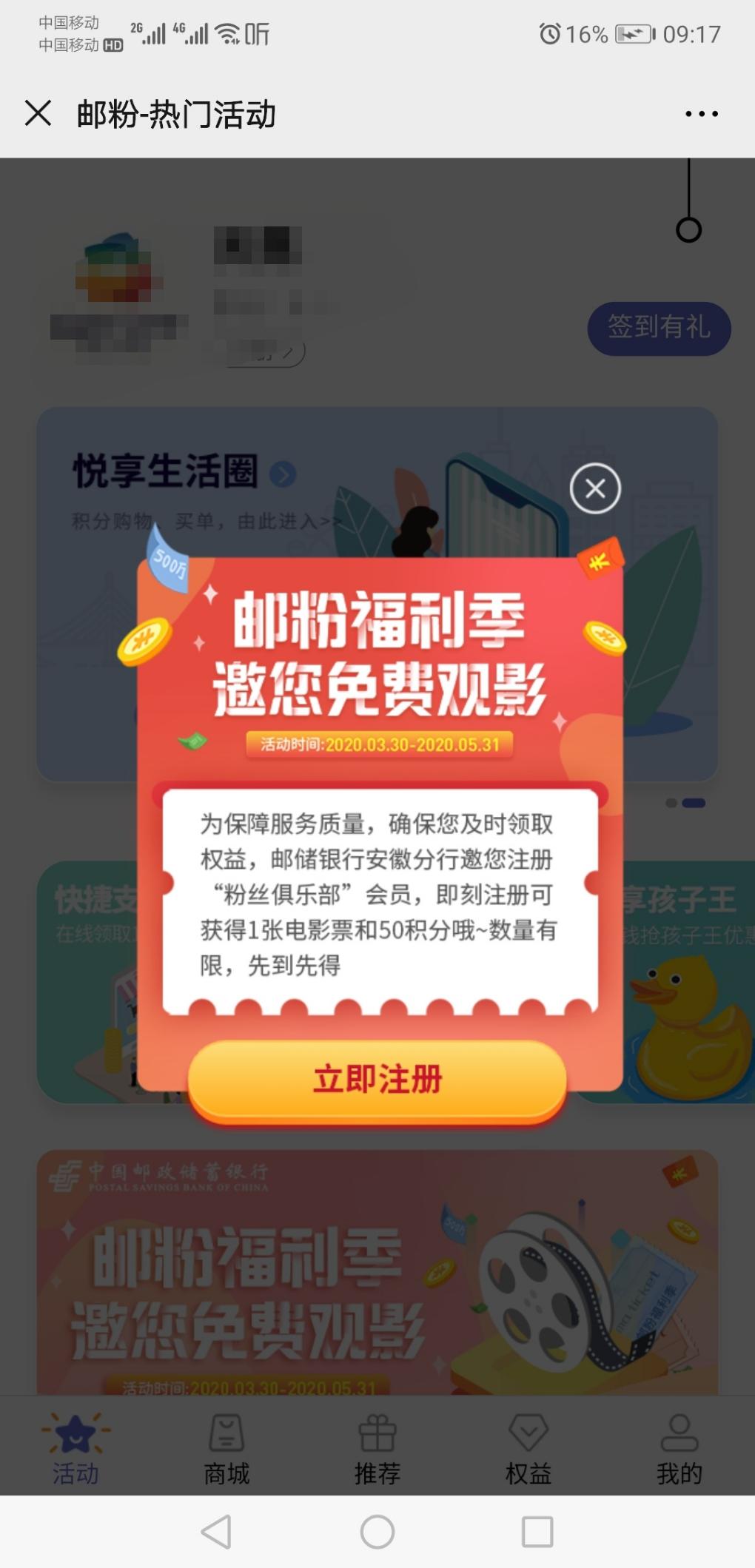 流程:微信关注邮储银行安徽分行 粉丝俱乐部 授权登录 粉丝节观影注册 送50积分和电影票一张 注册后在我的里面有一张电影票需要去兑换 商城去50积分兑换5元话费 可给任意号码充值 话费秒到 需要实名认证 很简单输入shen/份证号码个名字即可 不用照片 介意的就不用去了 银行活动肯定安全 好用加果果吧