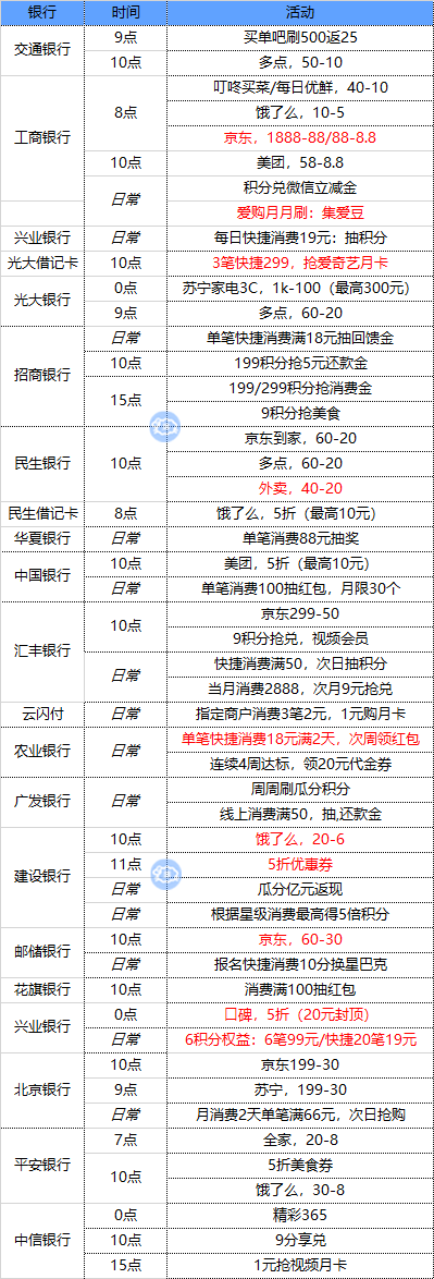 注:周一/支付宝、周二/微信、周三/京东苏宁、周四/云闪付、周五周六/买单吧、周日/美团(4月30日截止)