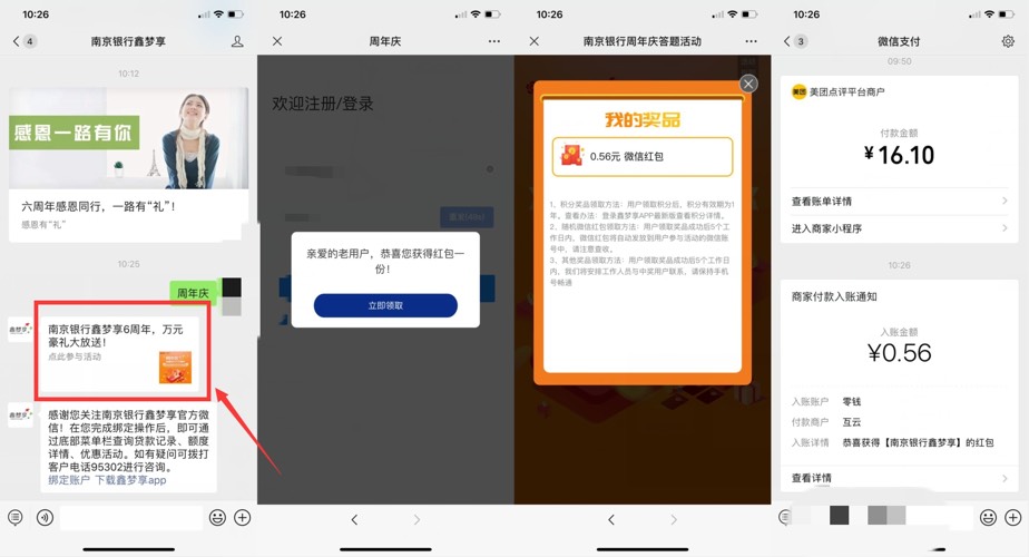 微信关注公众号“南京银行鑫梦享”答题抽红包->发送“周年庆”点推文进入答题抽红包->亲测中0.56元秒到账!