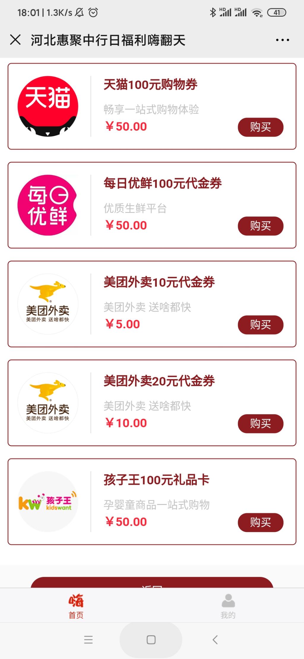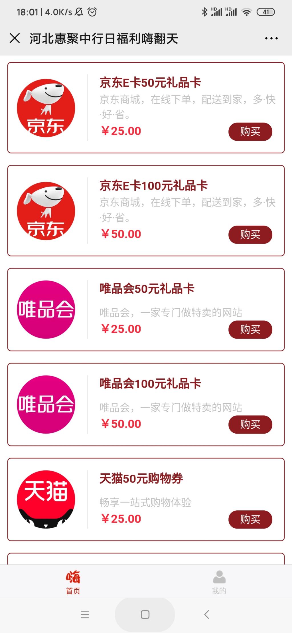 河北福利~中国银行河北分行五折买唯品会卡京东卡天猫卡