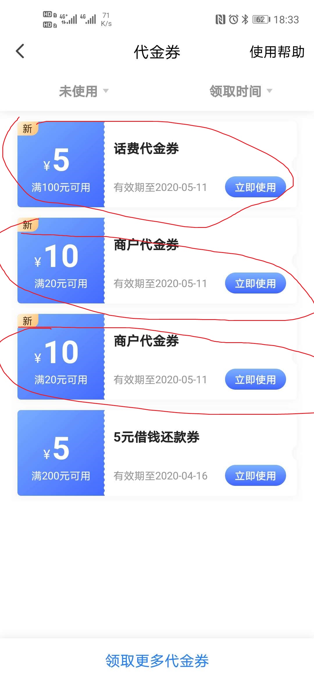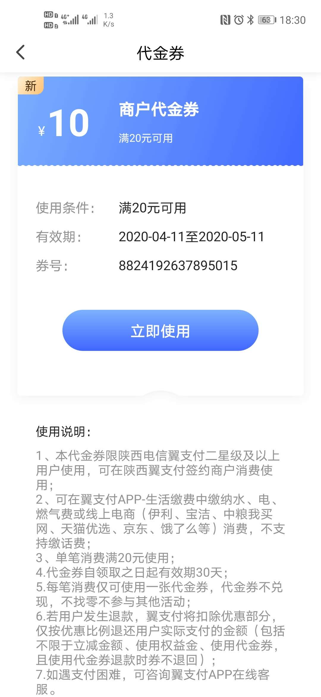 29.9或49.9支付后,前面三个月后面6个月,每月返2张20-10的商户券、一张100-5的话费券、还有一张翼支付的账户账抵用券!