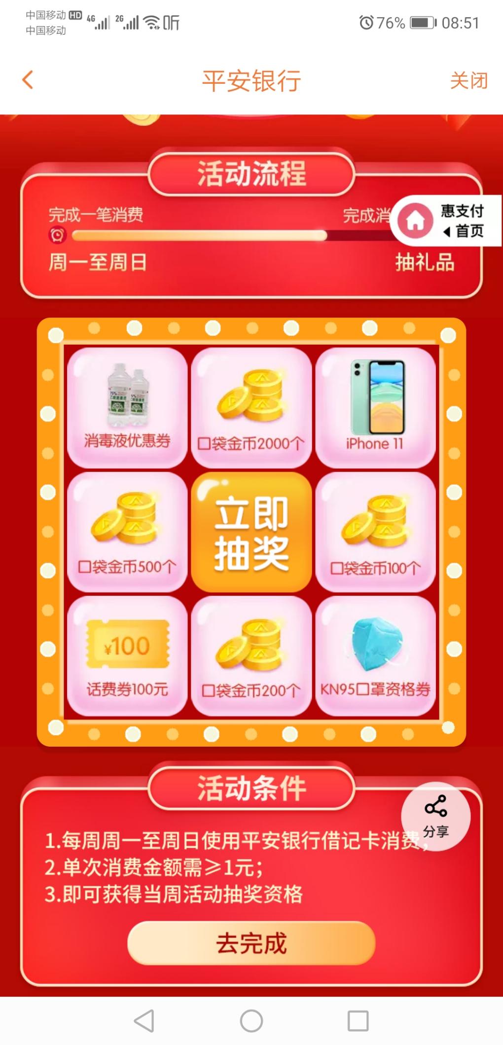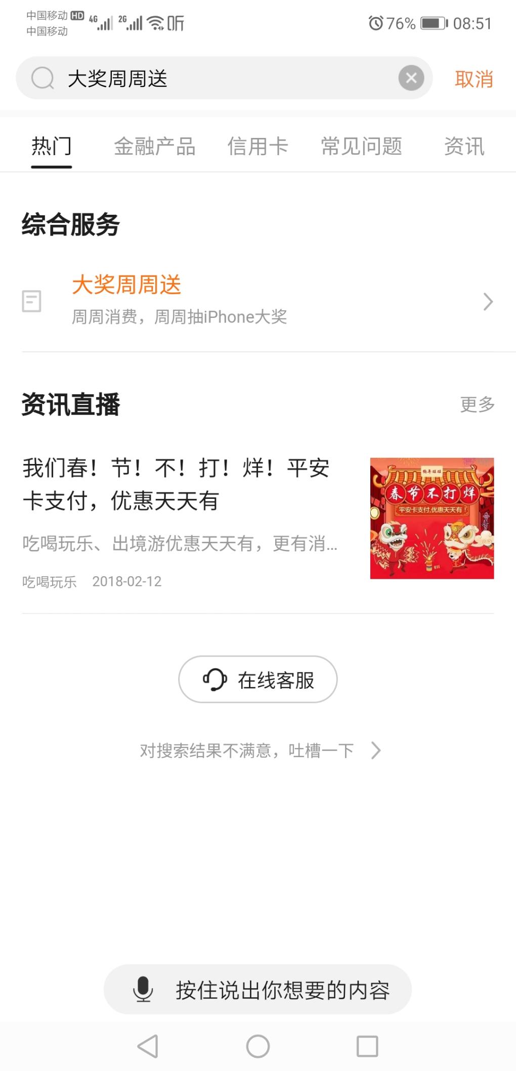 路径:平安口袋银行 首页搜索大奖周周送 抽奖即可
