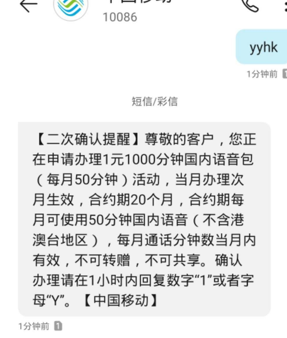 发送YYHK至10086,每月送50分钟通话,连送20个月,共1000分钟。
