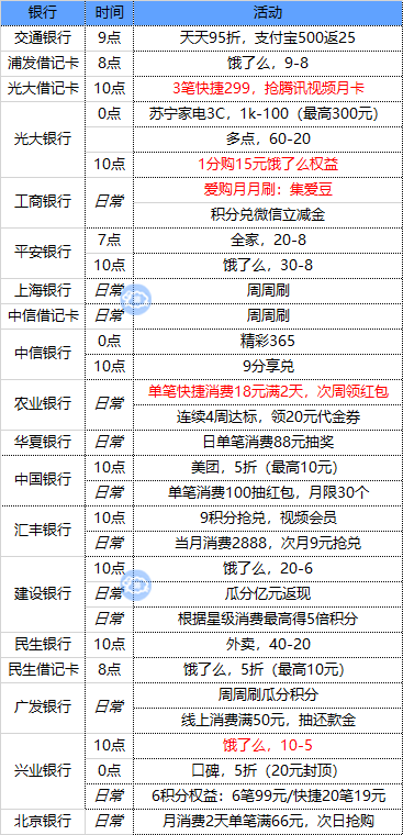 注:周一/支付宝、周二/微信、周三/京东苏宁、周四/云闪付、周五周六/买单吧、周日/美团(4月30日截止)