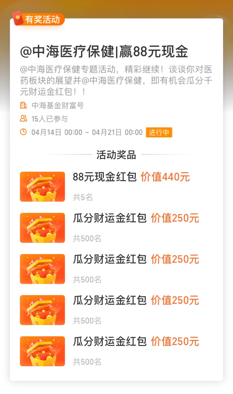 <中海基金财富号>@中海医疗保健|赢88元现金(4月21日截止)