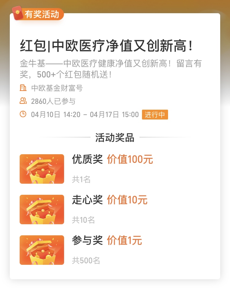 <中欧基金财富号>红包|中欧医疗净值又创新高!(4月17日截止)
