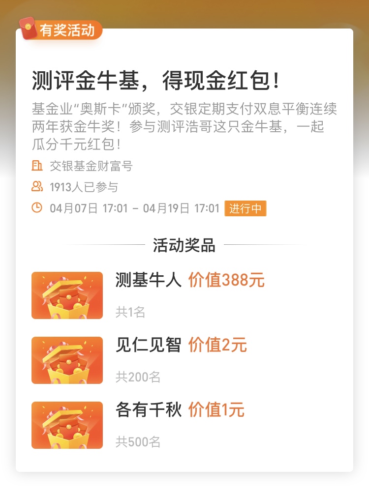 <交银基金财富号>测评金牛基,得现金红包!(4月19日截止)