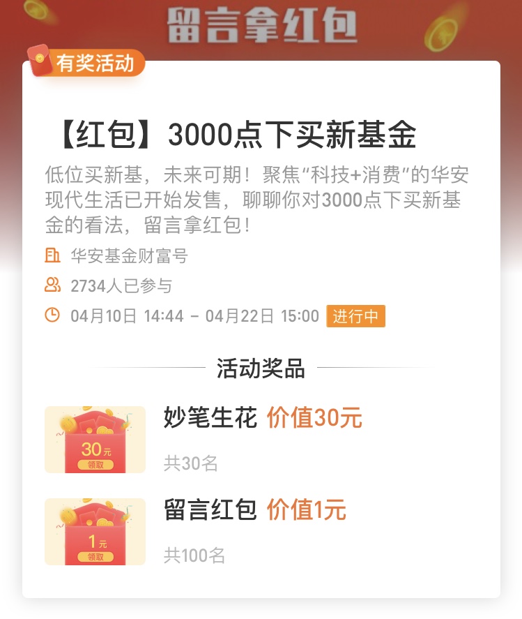 <华安基金财富号>[ 红包 ]3000点下买新基金(4月22日截止)