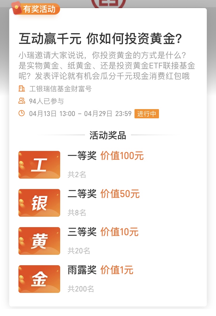 <工银瑞信基金财富号>互动赢千元 你如何投资黄金?(4月29日截止)