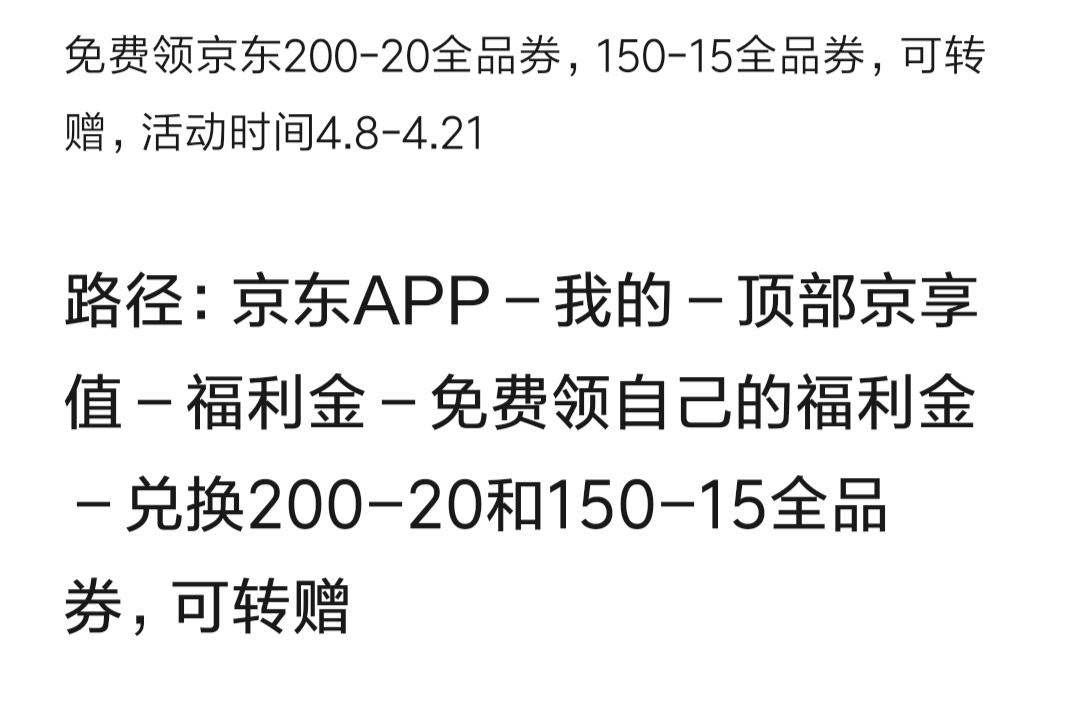 免费领京东200-20全品券,150-15全品券,可转赠,活动时间4.8-4.21