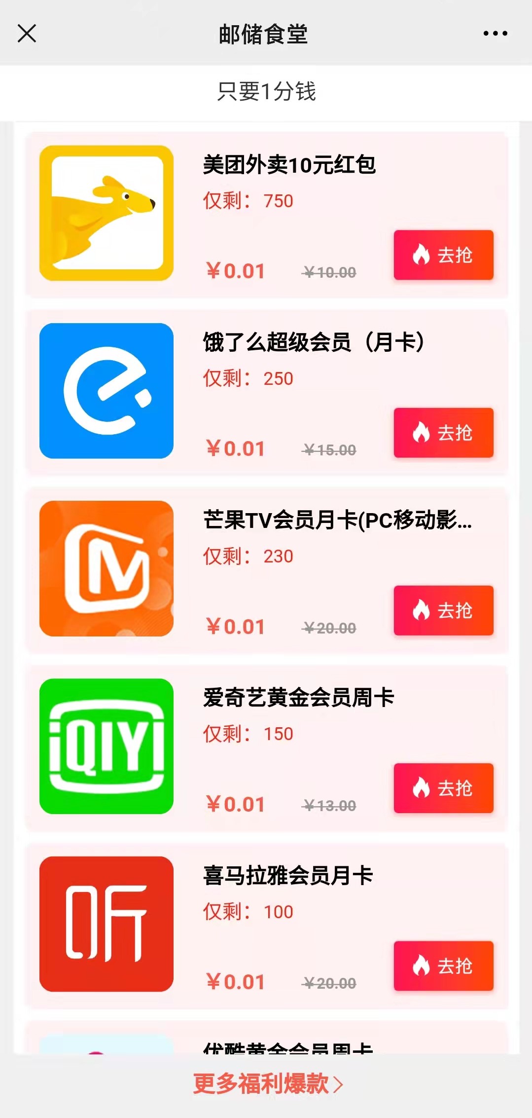 8点补名额,邮储食堂1分钱买10元美团外卖红包等