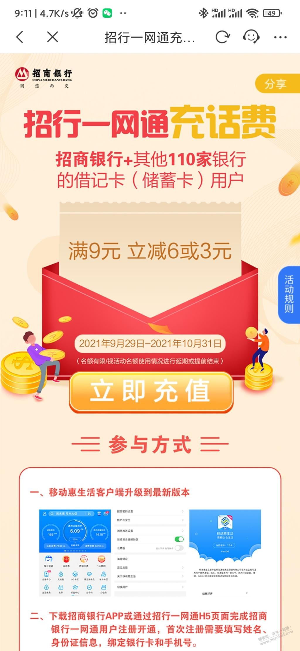 移动惠生活app充值,选招商银行支付,配合平时签到的立减金可以做到 11-8或者11-5