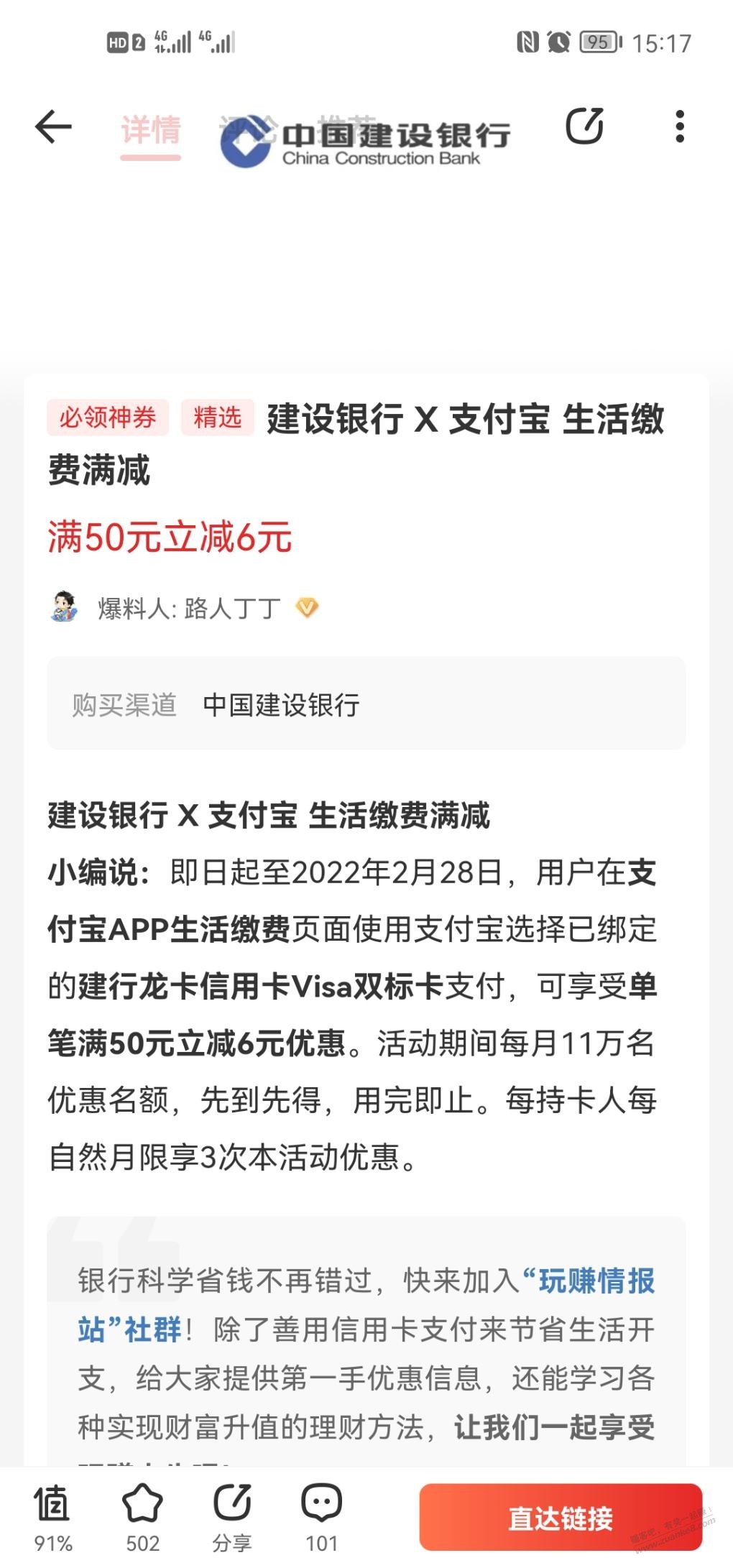 建行Visa双标卡生活缴费50-6,每月三次
