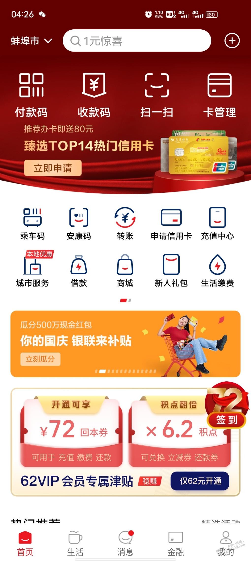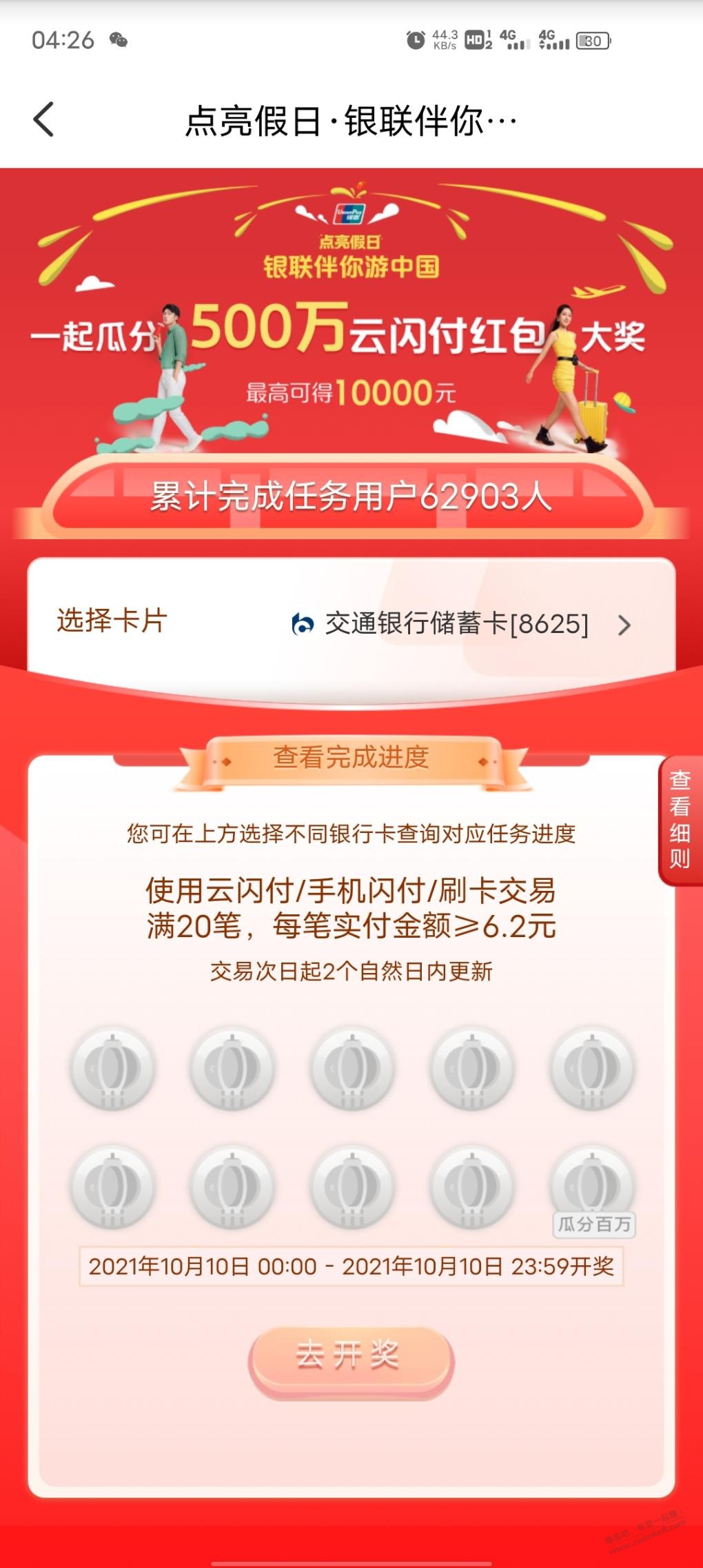 云闪付首页中间这个活动银行卡报名规定单笔金额大于等于6.2付20笔 可瓜分500w 听起来很牛皮,重在参与目前6w多点人完成了 期待下
