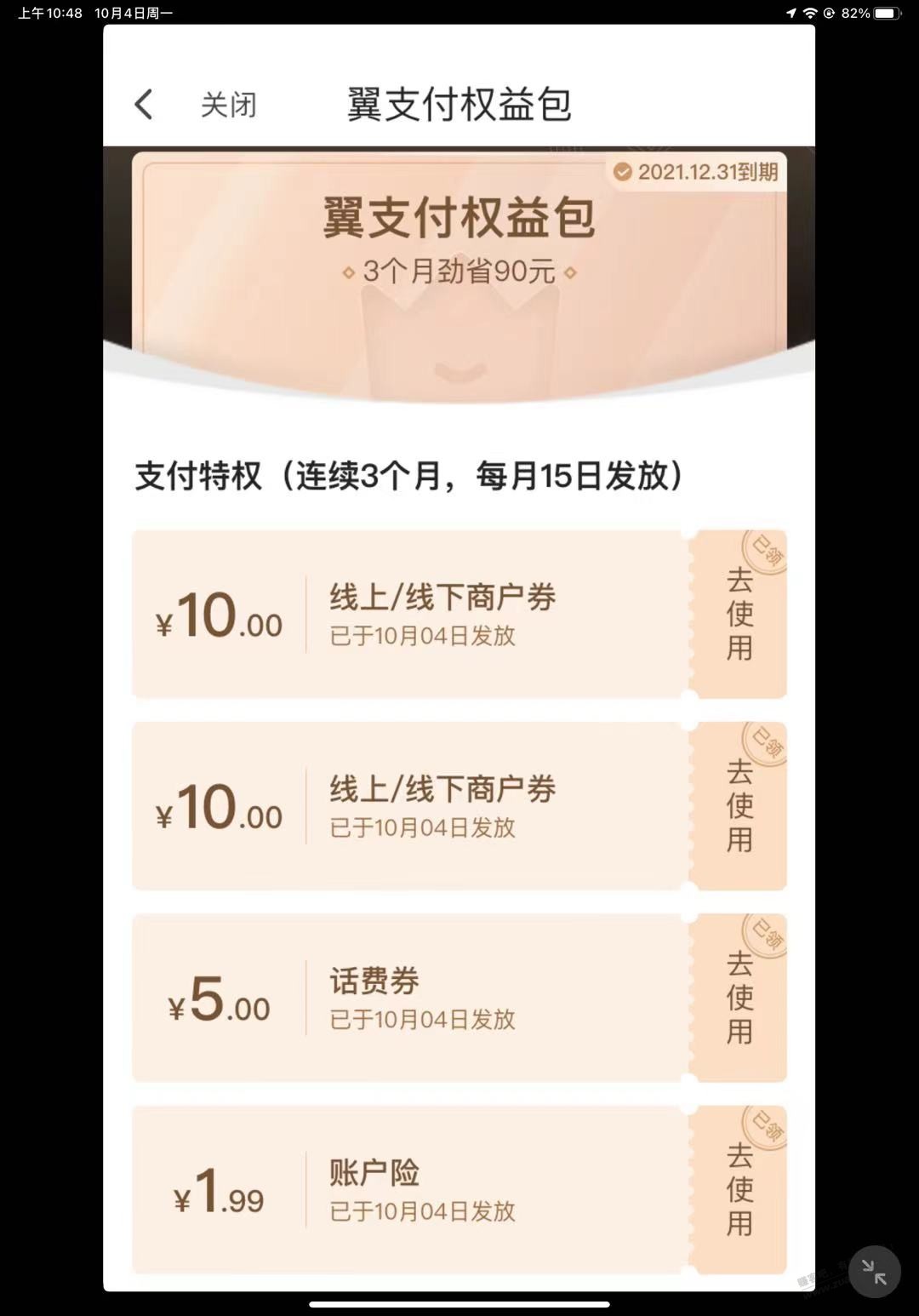 打开翼支付自动弹窗的,19.9三个月,每月两张20-10商户券,亲测京东付款可出,10-5水煤电代金券,100-5话费券这个可有可无,坐标陕西西安,其他的地区自测,名字就叫翼支付权益包。