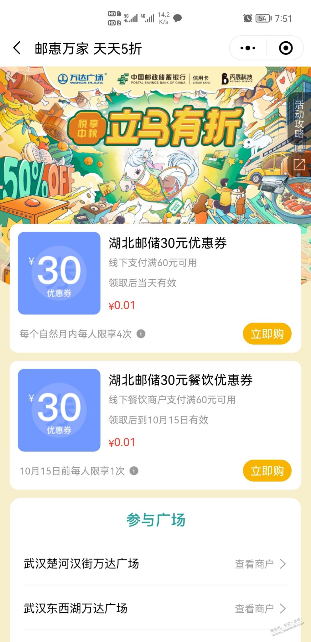 友情提醒,湖北万达邮储60-30,餐饮券和通用券可以叠加,合计60-60