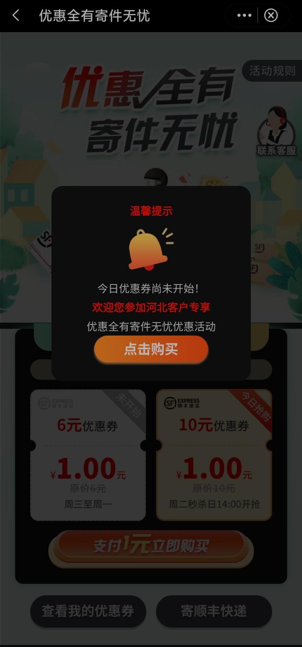 中国银行APP生活版块,点顺丰速运进去就能看到1买10顺丰券,河北地区现在就可以购买,其他地区的用户需要下午14点抢购。