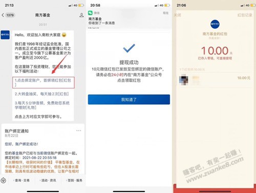 微信关注公众号“南方基金”推文点进去->没推取关重新进 进入注册实名开户 秒过->再下载app 卡券领取 绑定账户3.28r 开户10r 一共13.28元->闻弟群友亲测秒推!