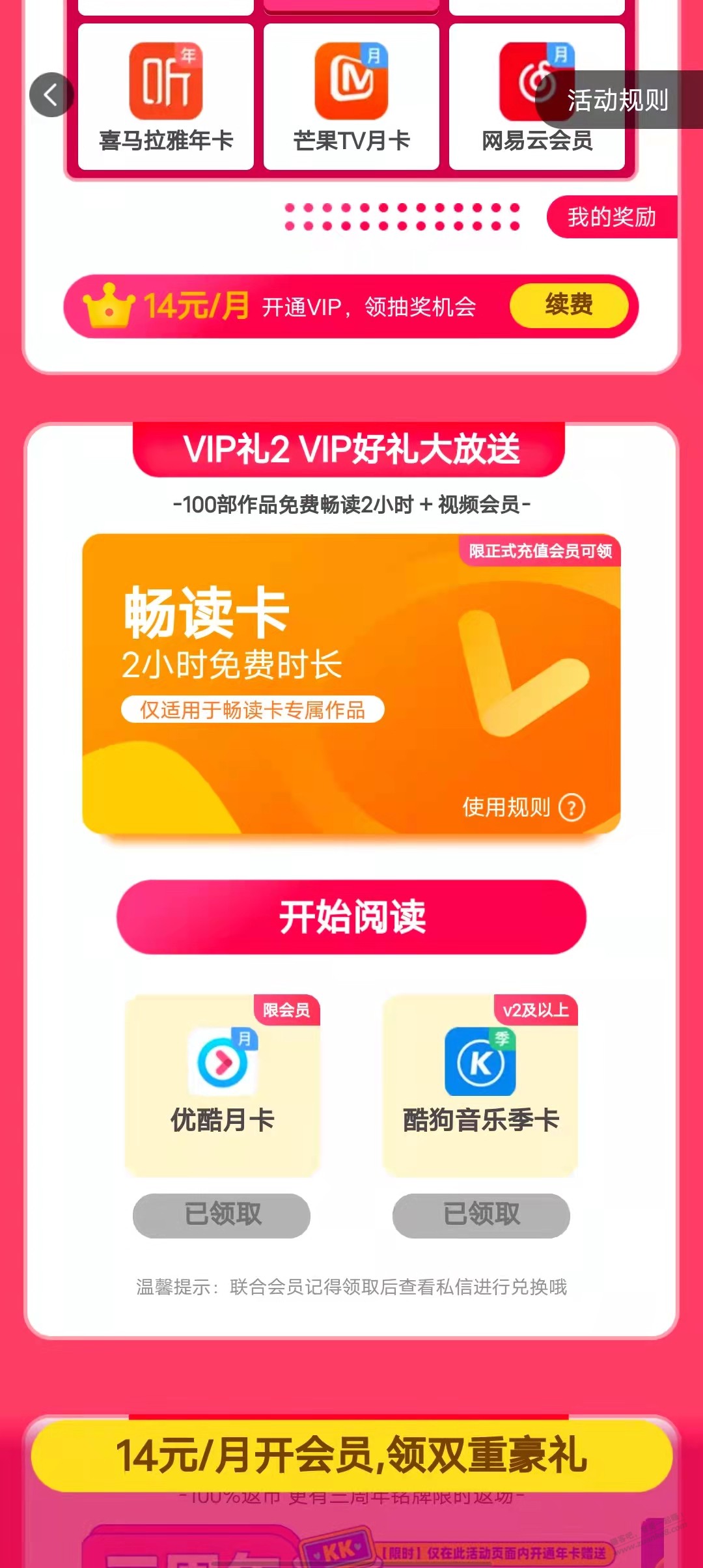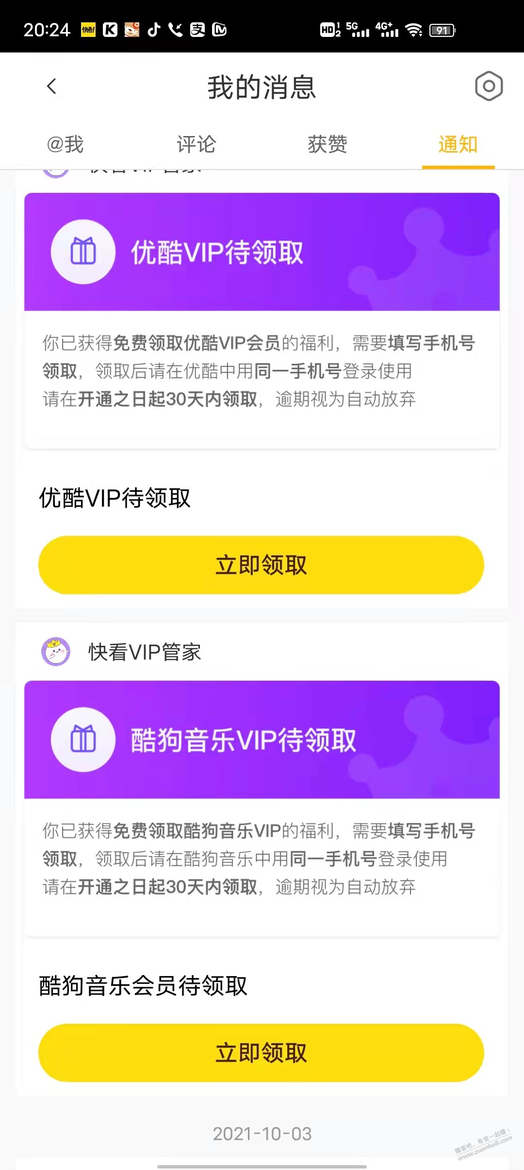 之前开过快看VIP的领优酷月卡和酷狗季卡