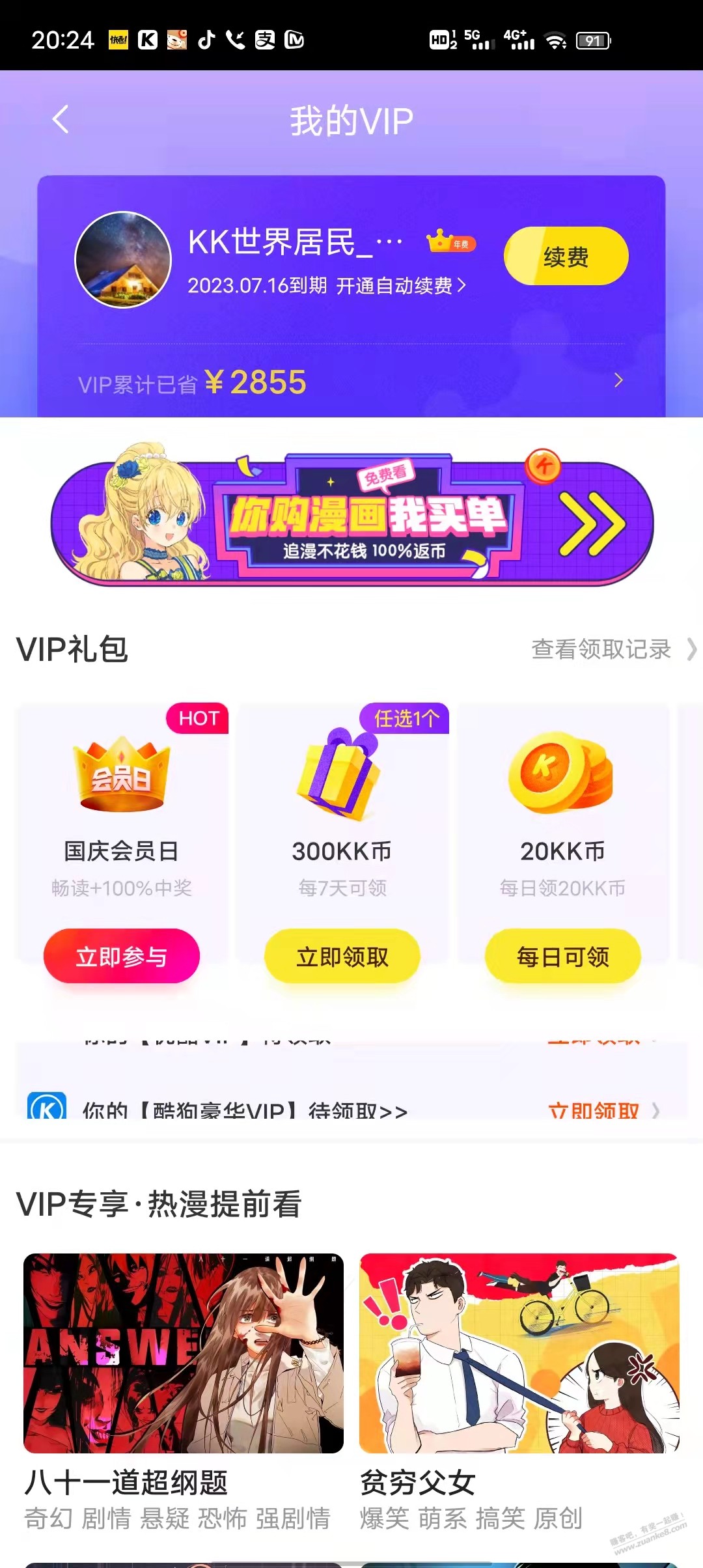 路径:快看app- 我的-中间 快看VIP-VIP礼包下面国庆会员日下拉,领取之后需要去我的 消息充值,只能自己手机号