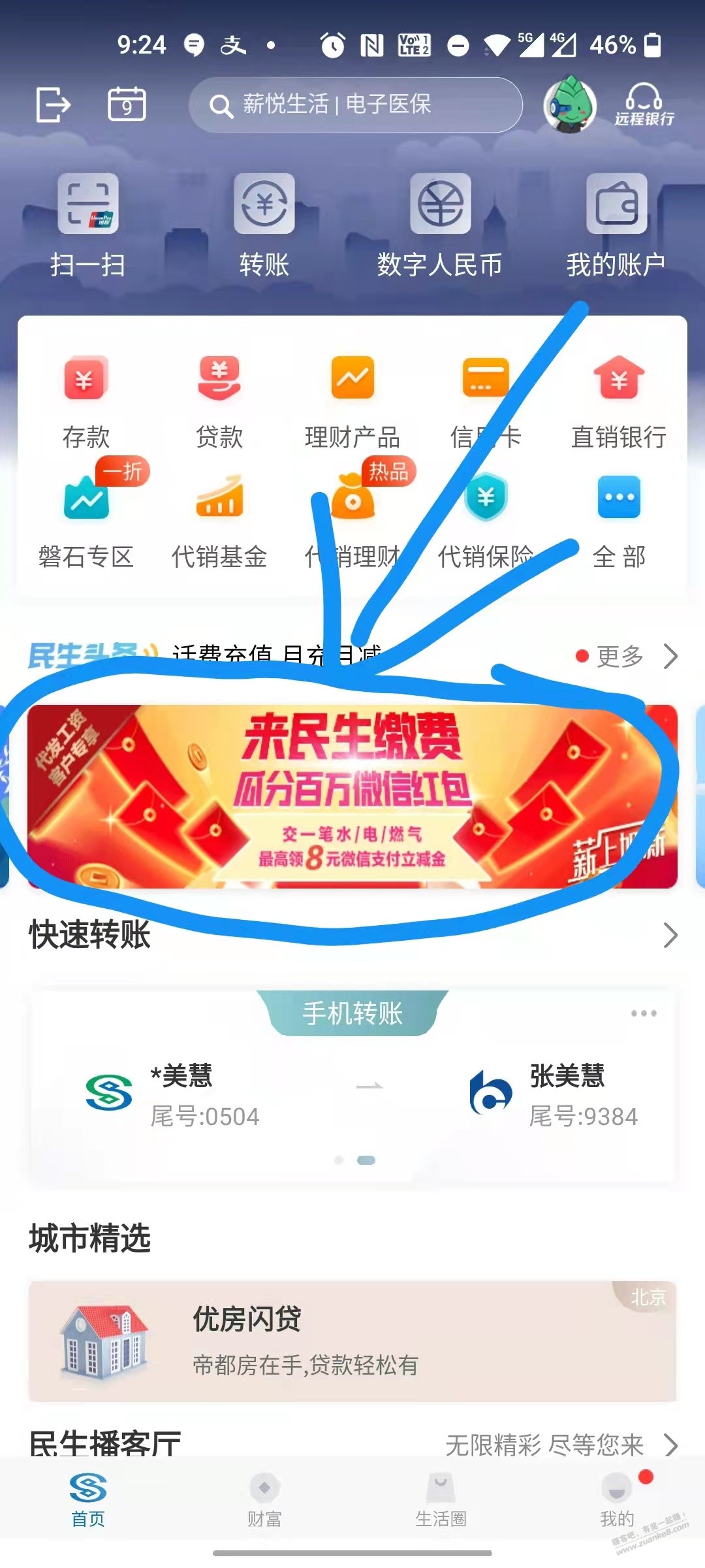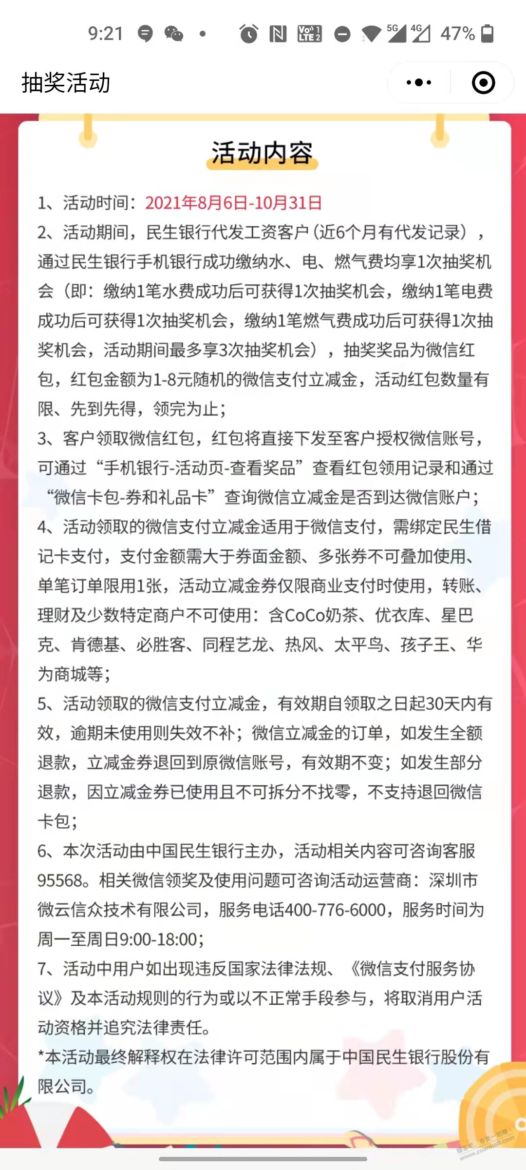 民生银行app首页条幅,这来回滑动就有这个条幅了,冲1元水费、电费、煤气费就可以抽一次奖,一共可以抽三次。