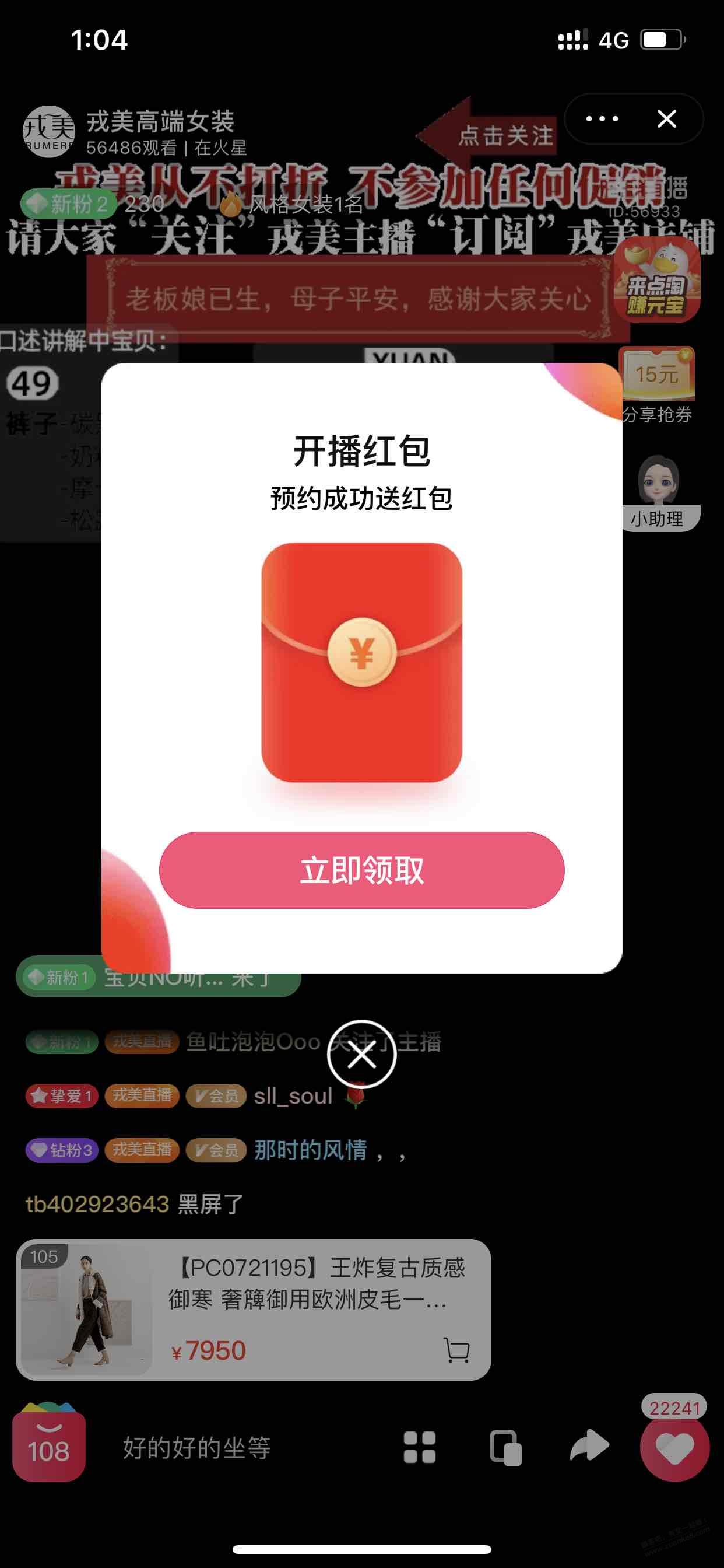 淘宝app直播,戎美直播间,昨天领过的可以进去领分享红包