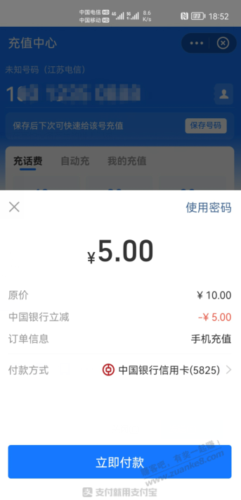 支付宝付款满10-5,刚试了中国银行储蓄卡,中国银行xing/用卡满10-5。吧码不行,冲话费可以。缴水单费没试。