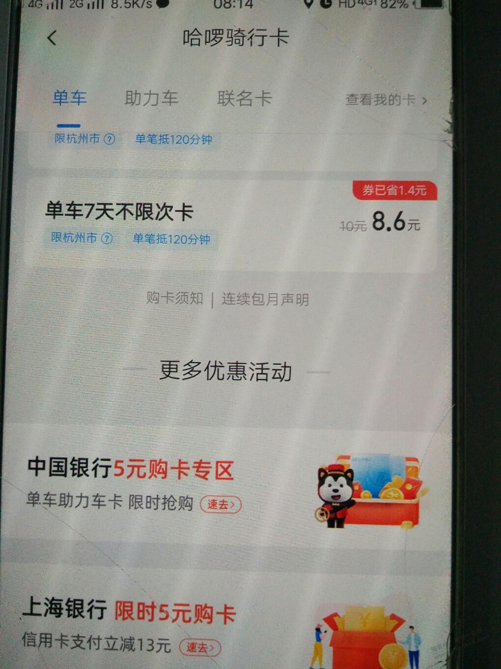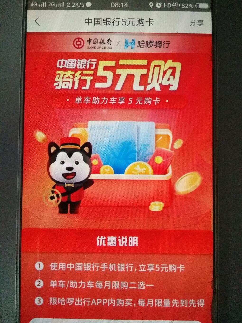 哈啰单车中国银行5元月卡