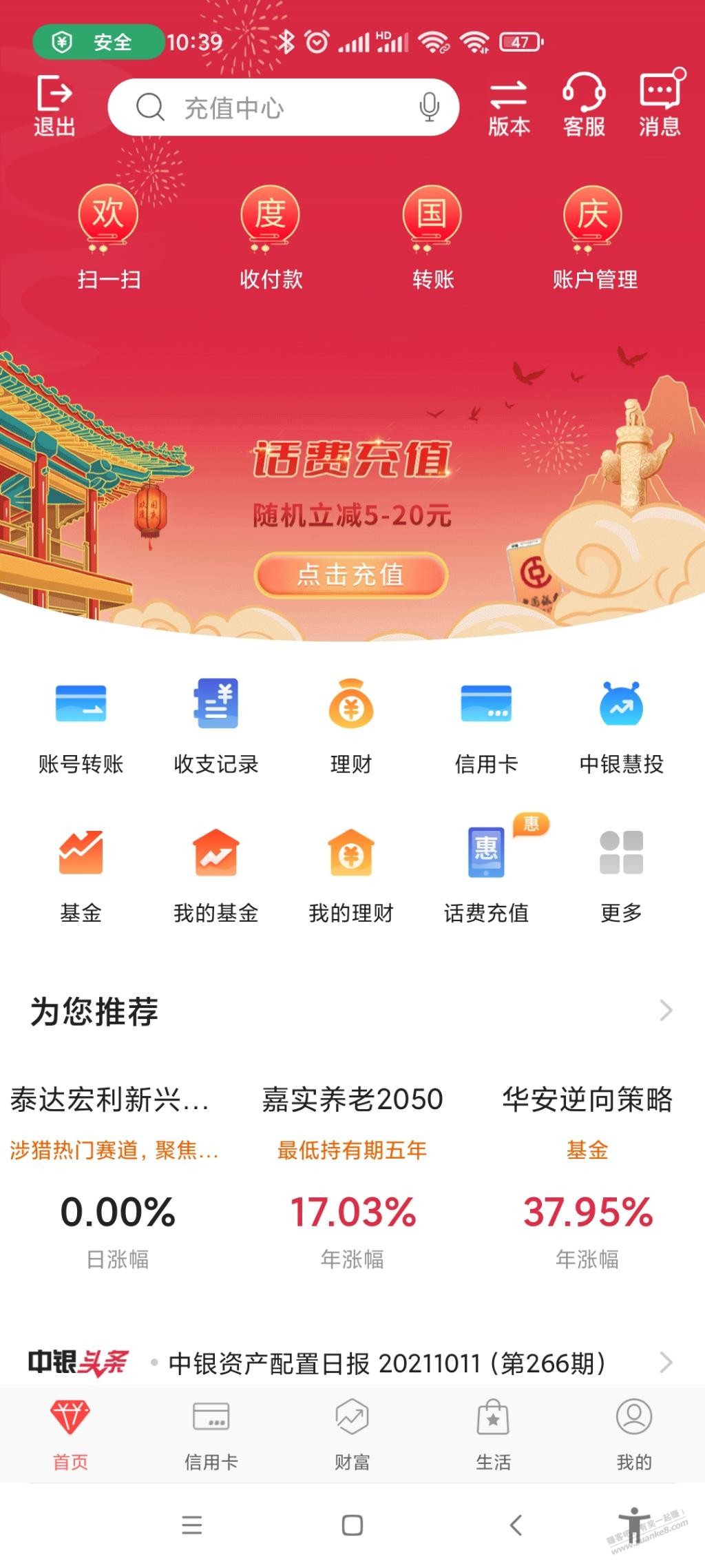 优惠升级!充话费至少省7元,10月底前通过手机银行先签到领券再充值(限当月首次充值),登录手机银行 首页 热门活动 签到有礼或点击链接