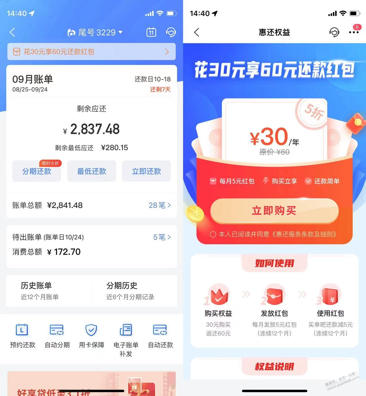 买单吧-xing/用卡-账单明细-花30元享60元还款红包