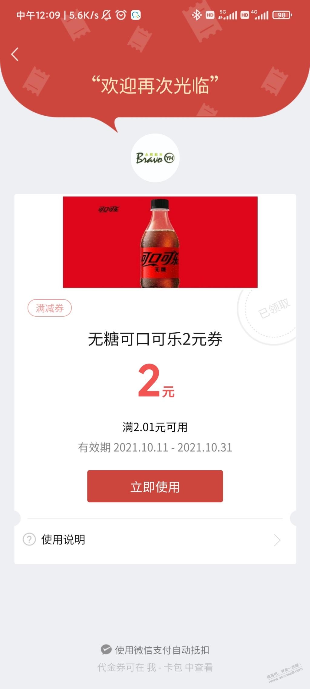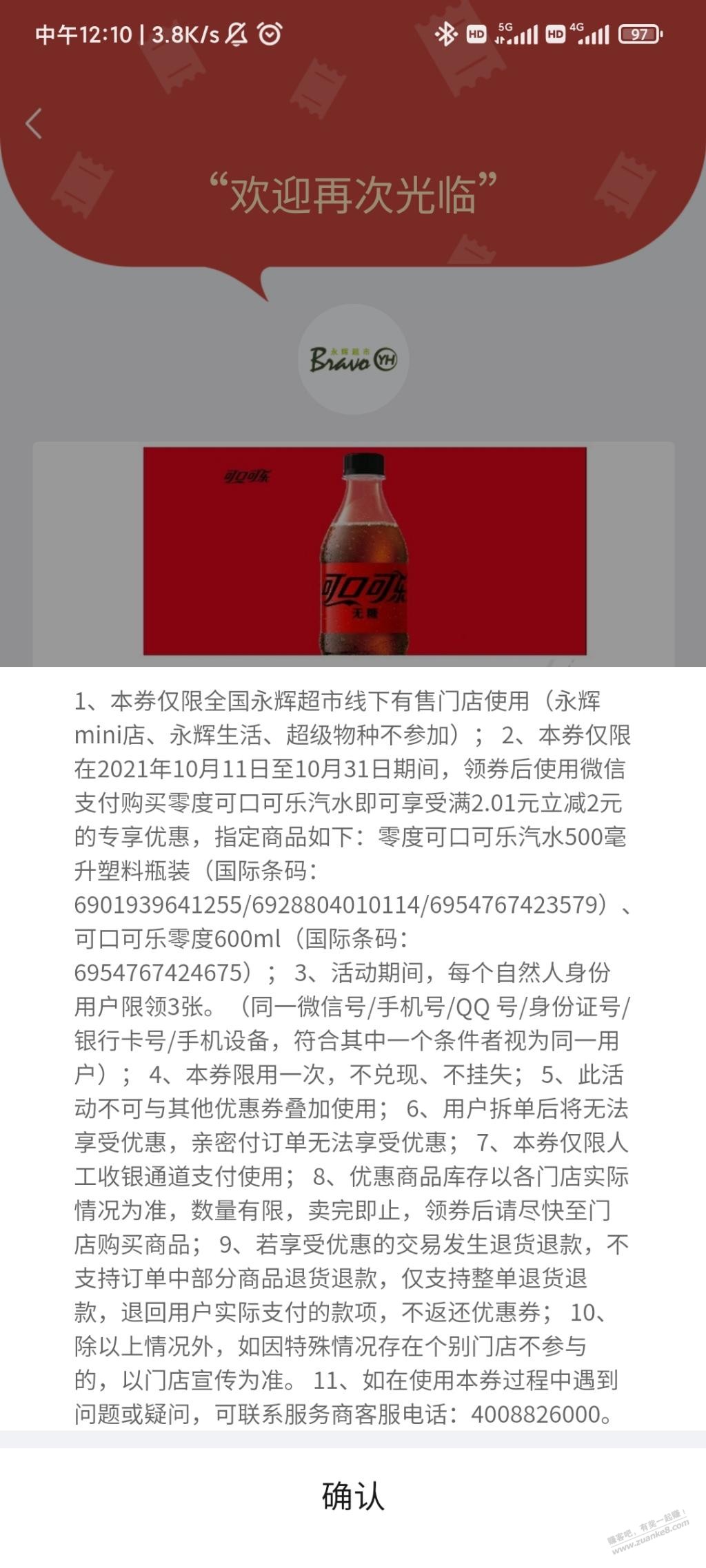 永辉超市可口可乐无糖2元券