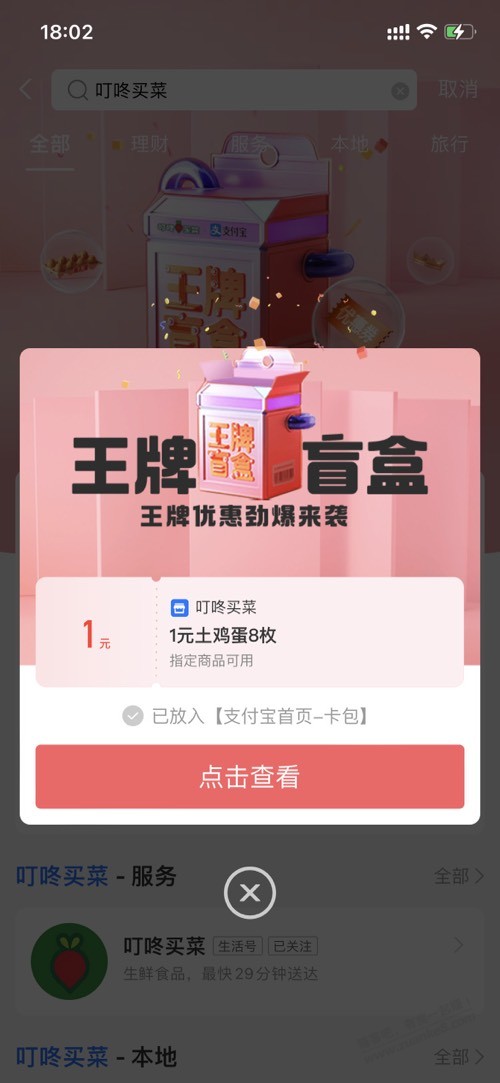 支付宝搜索叮咚买菜。上面摇一摇1元鸡蛋