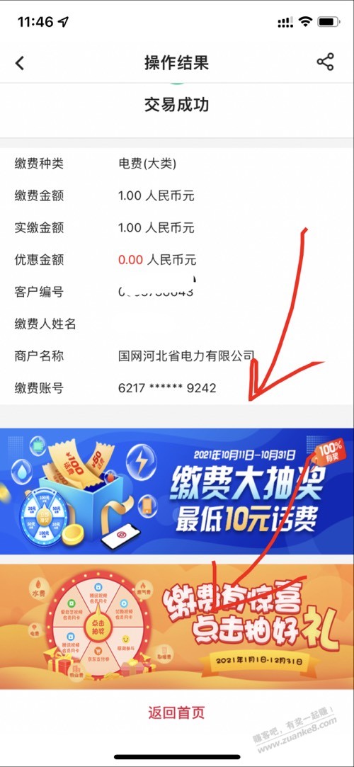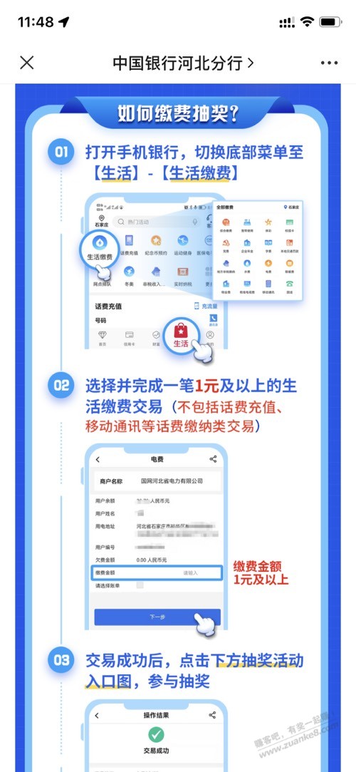 生活缴费1元,不包含通讯话费充值!路径见图1,交完费抽奖有两个见图2,除河北外,其他地区自测!