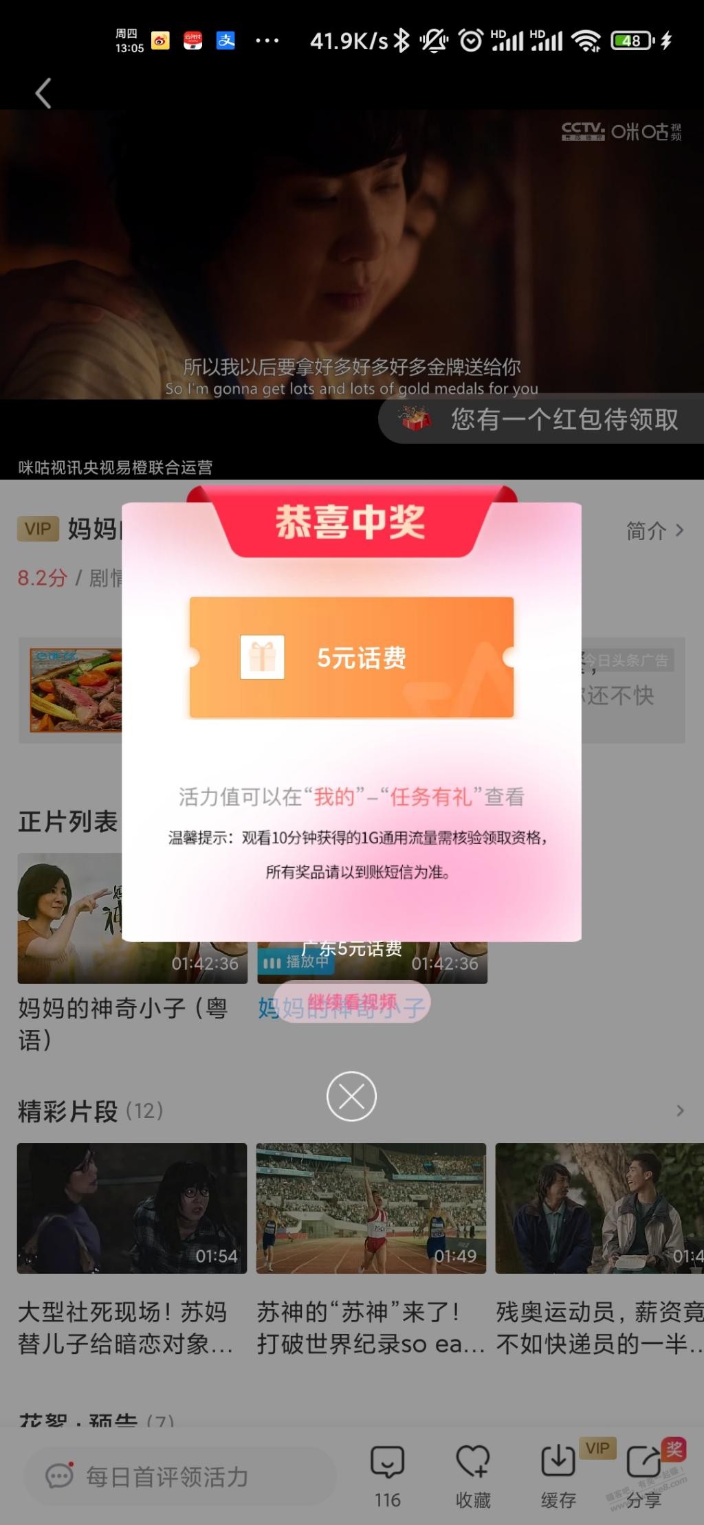 第二波 咪咕视频随便找个视频,点进去观看30分钟,视频右下角抽5元话费