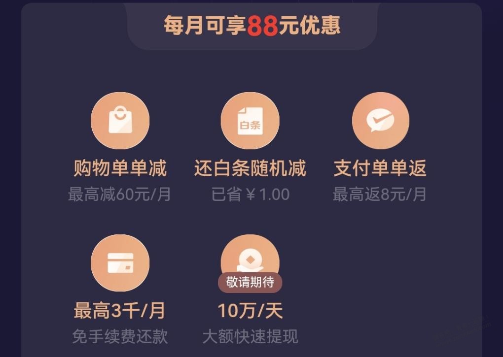 这两个都开通后,还白条随机减,我减了1元,我看最高减20,然后就是微信消费使用e小金卡,也就是厦门国际银行的卡,单笔返0.05%,单笔限返1元直接到小金库,月最高8元,年最高25元。