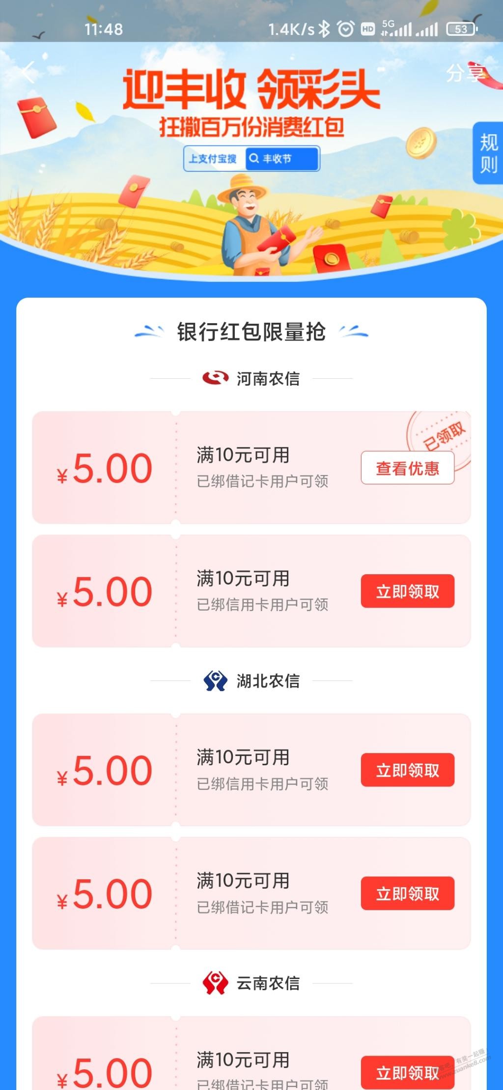 支付宝农信银行5元红包,速领