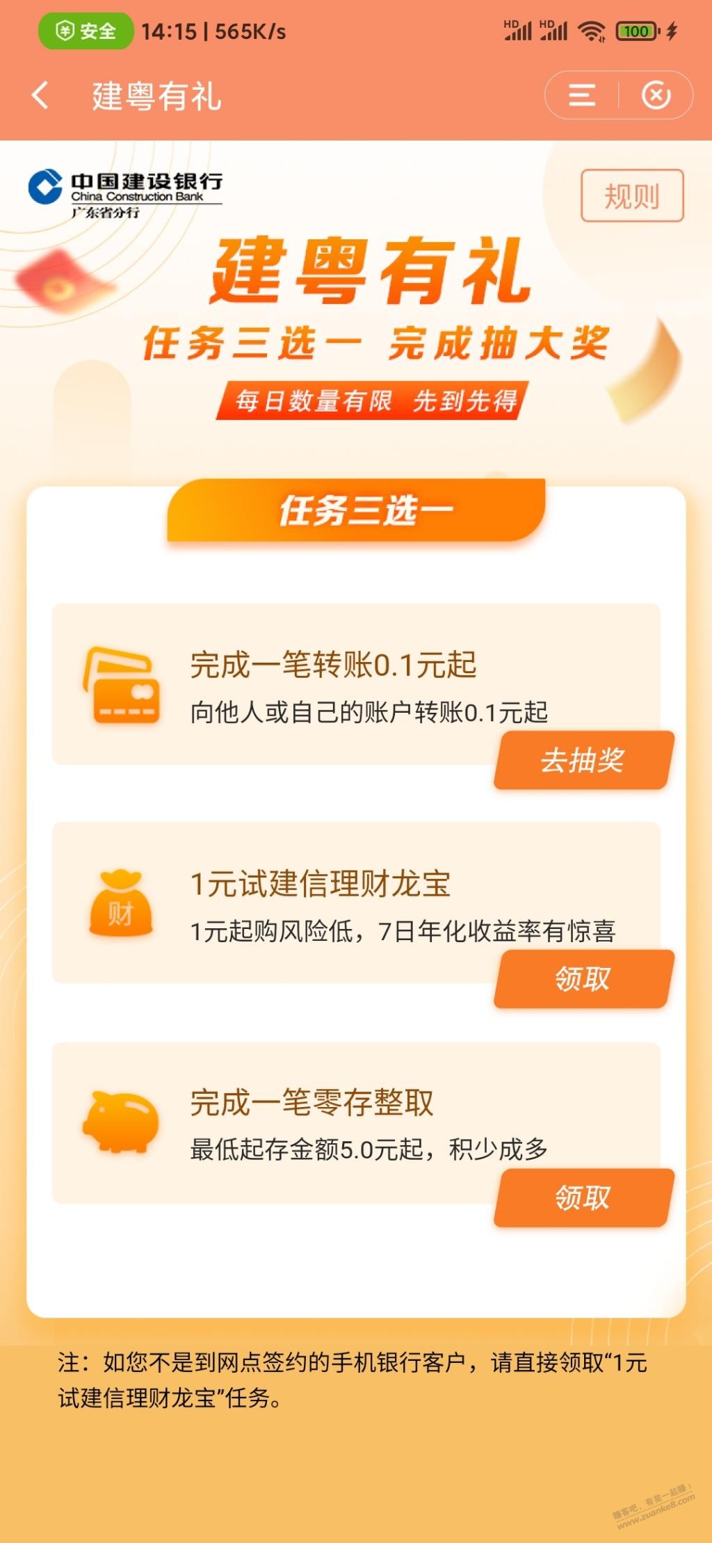 建行app-首页一分抢礼-建粤有礼,转账0.1抽奖,刚中了3立减金