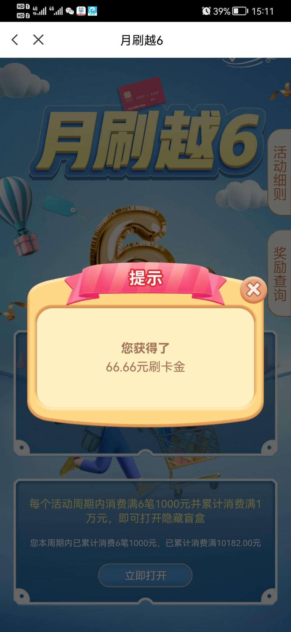 浦发首页 月刷越6 刷6笔大于等于1000,抽开奖,目前大概率中66.66,然后再刷4000满10000,再抽个盲盒,目前都是66.66
