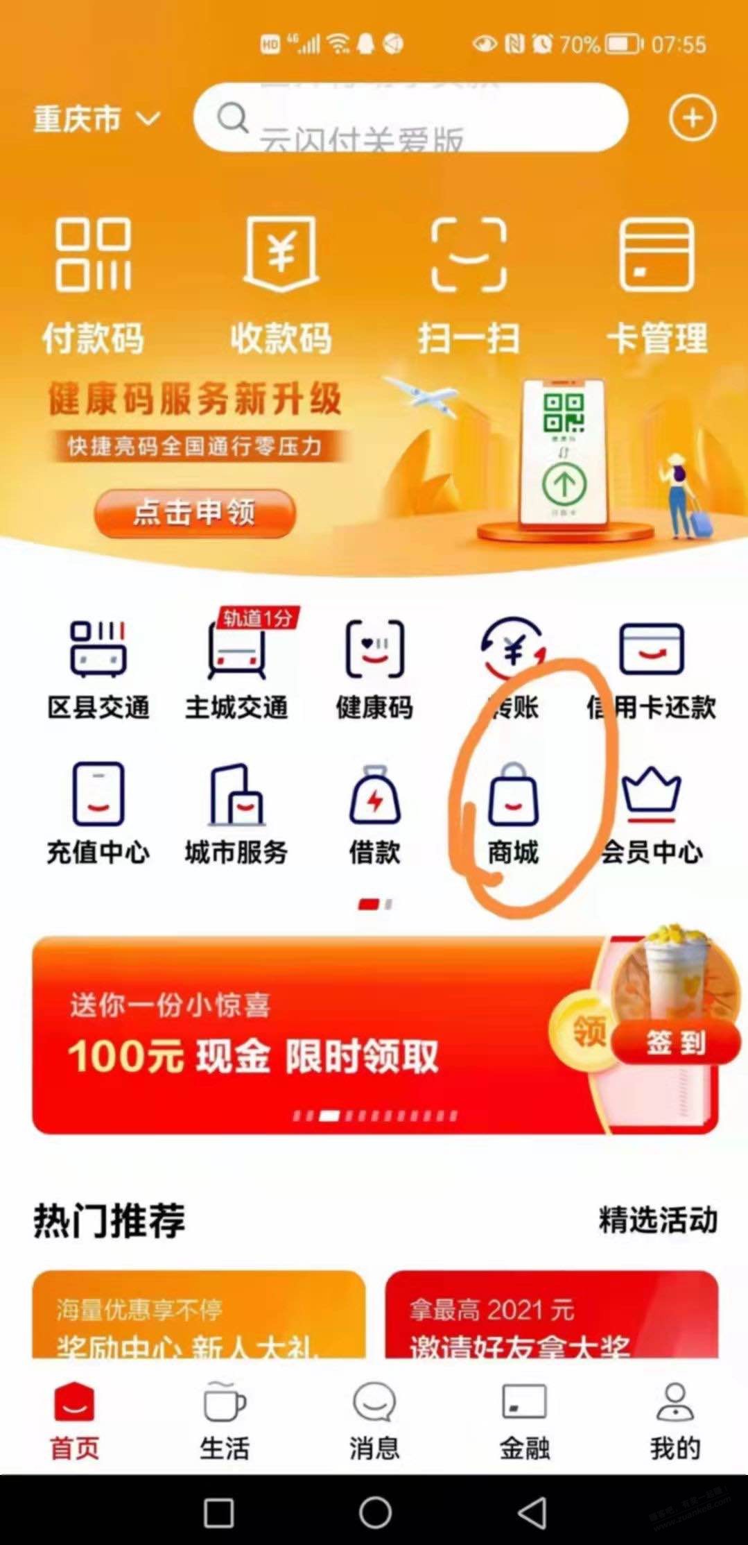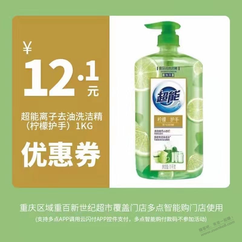 云闪付一商城一搜重百或者超能洗洁精0.1买券然后超市去多点结账付款1.9。