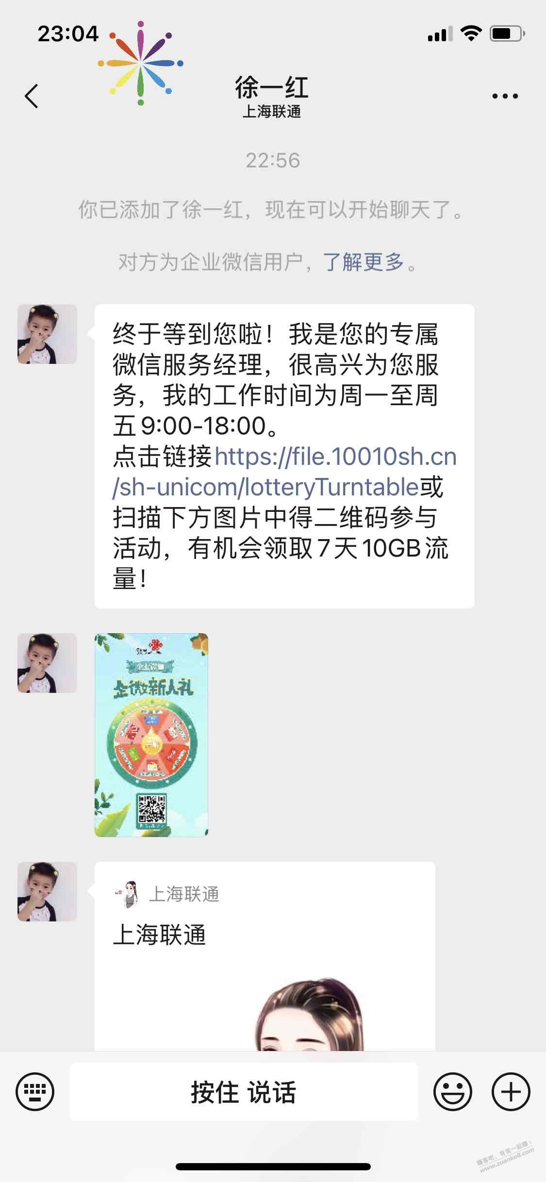 关注 沃派上海 公众号,左下角老生专区-流量查询,登陆后点击联系客服经理,会显示客服经理的企业微信二维码,添加后,客服经理微信会自动发送抽奖链接给你,我抽中10E卡。