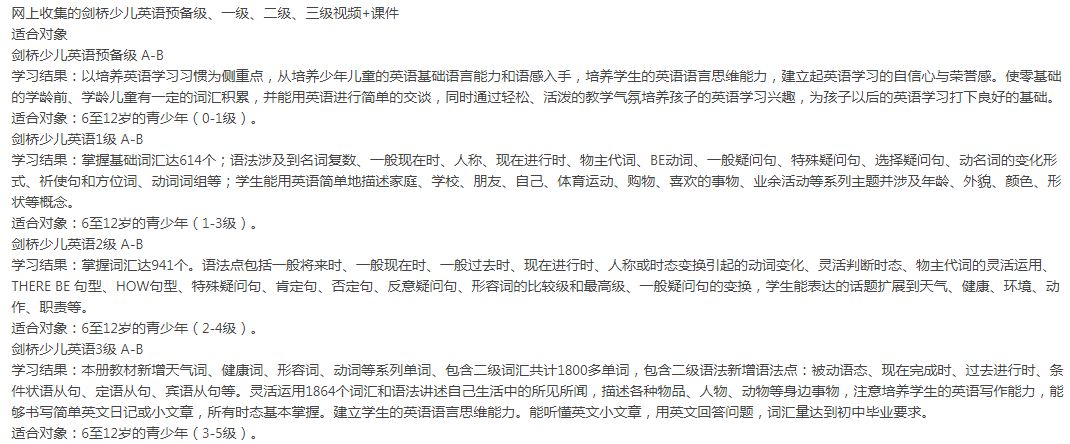 剑桥少儿英语预备级、一级、二级、三级视频+课件