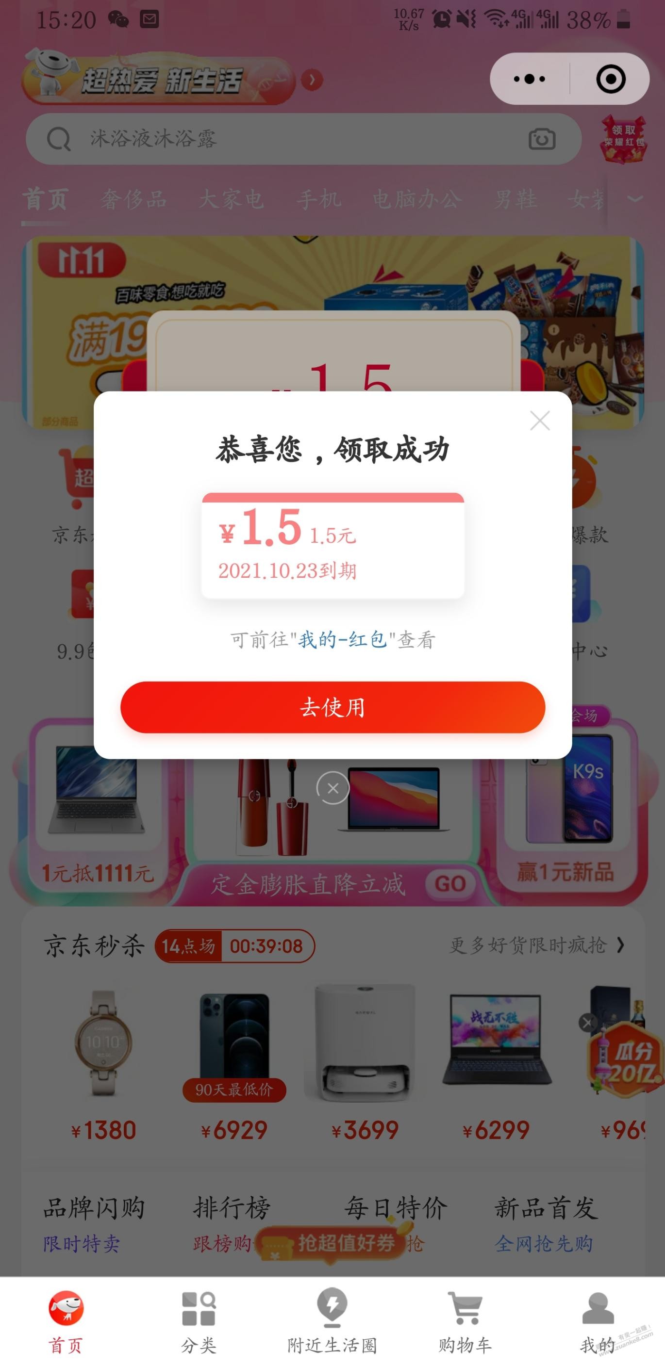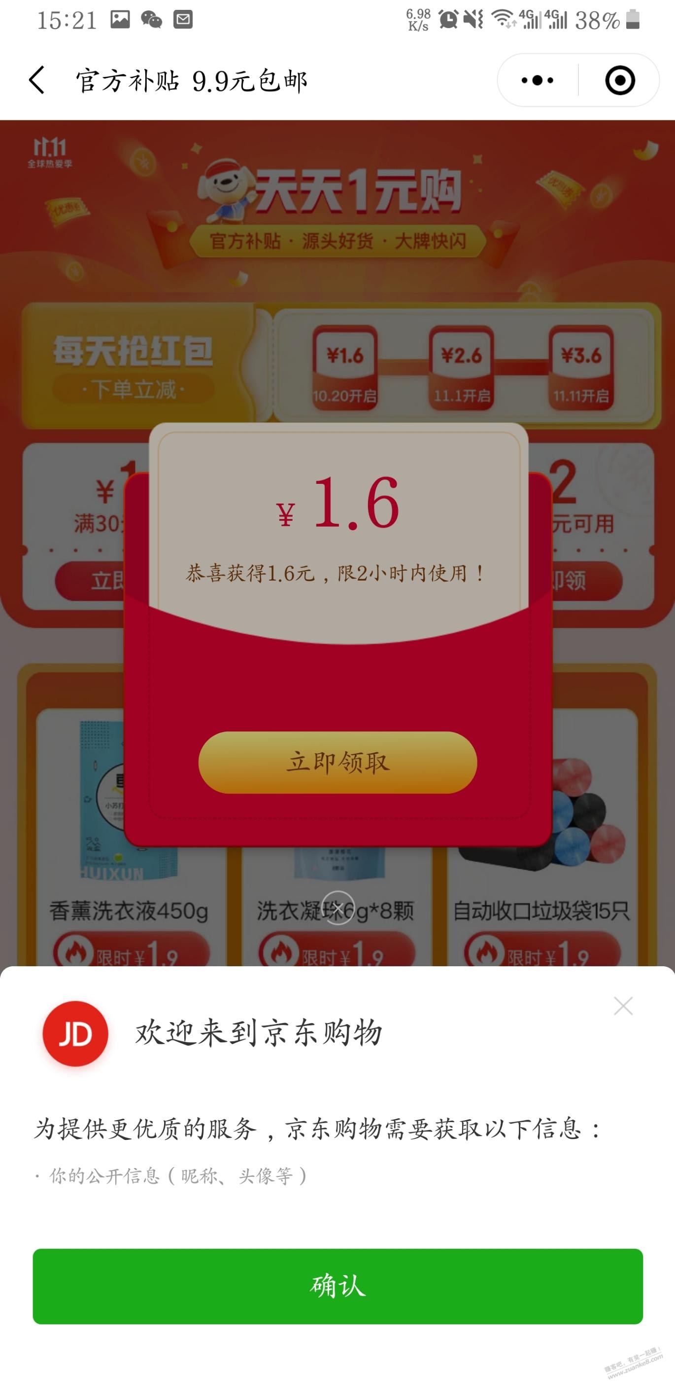 京东购物小程序等会自动弹1.5,不弹的购物车上面看下。然后首页那个9.9包邮进去弹1.6红包,之前出过,这次又弹了。