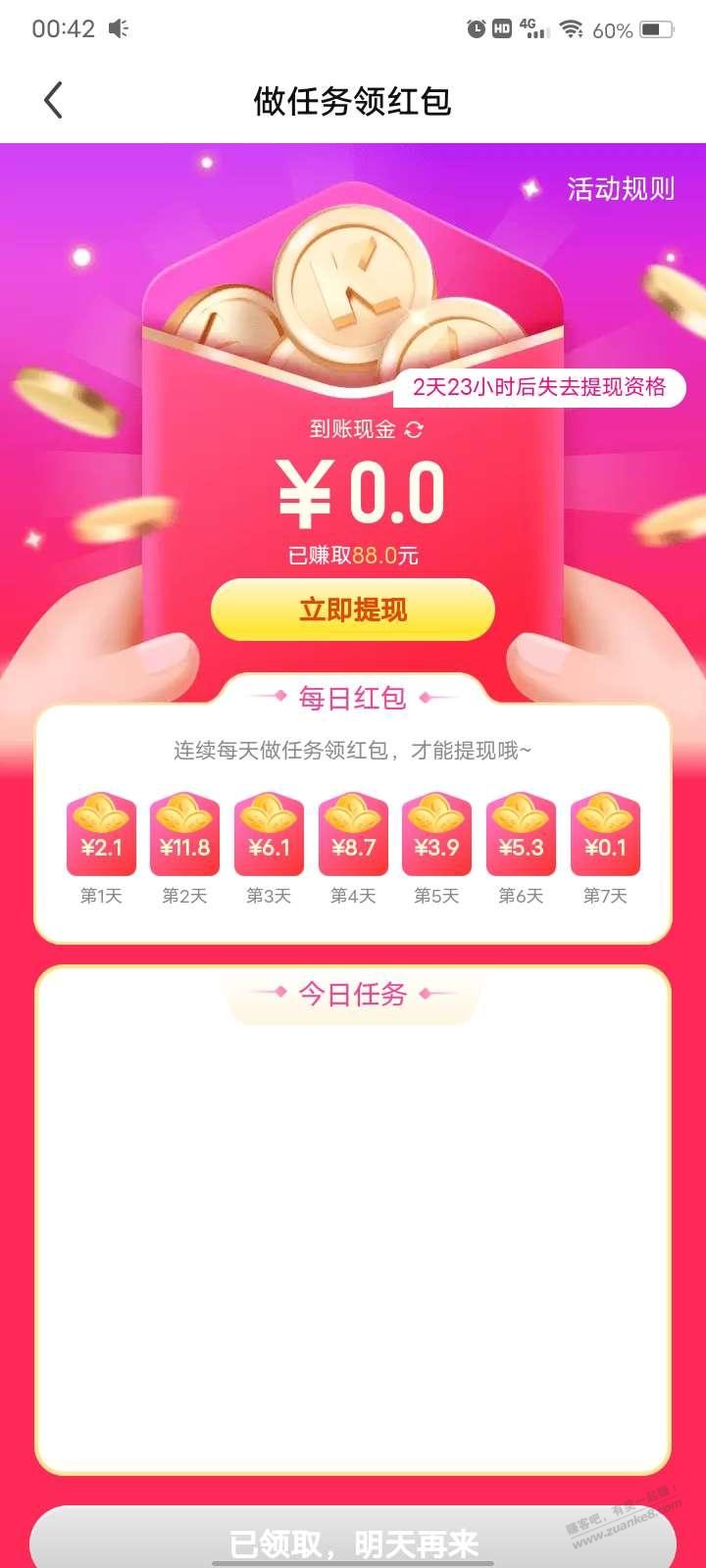 下载酷狗直播连续签到一个礼拜领取88元,部分人有,首页推荐右下角有立即领取红包图标就有这个活动!!